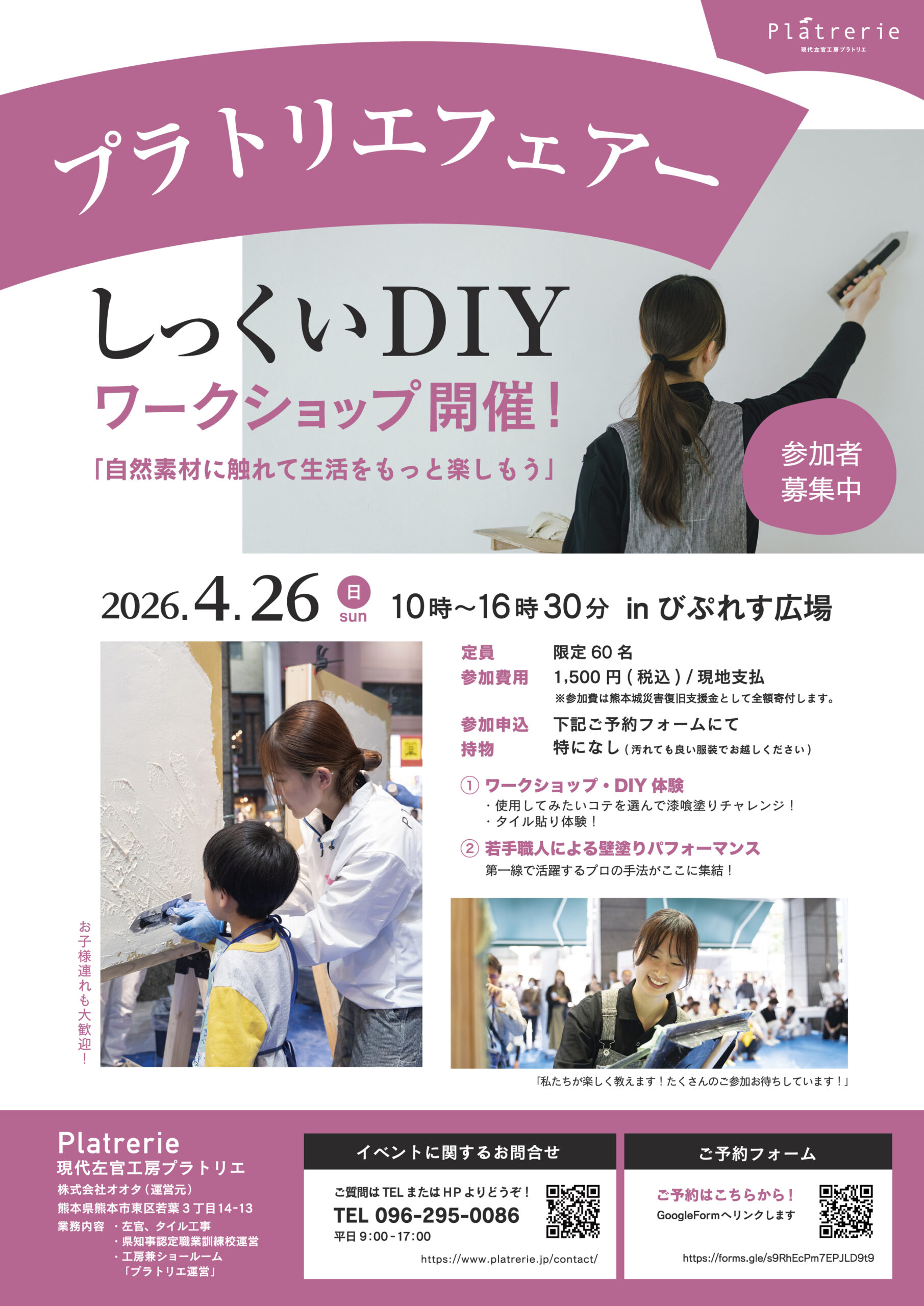 しっくいDIYワークショップの参加には事前予約が必要ですので下記ご確認の上お申し込みくださいませ。